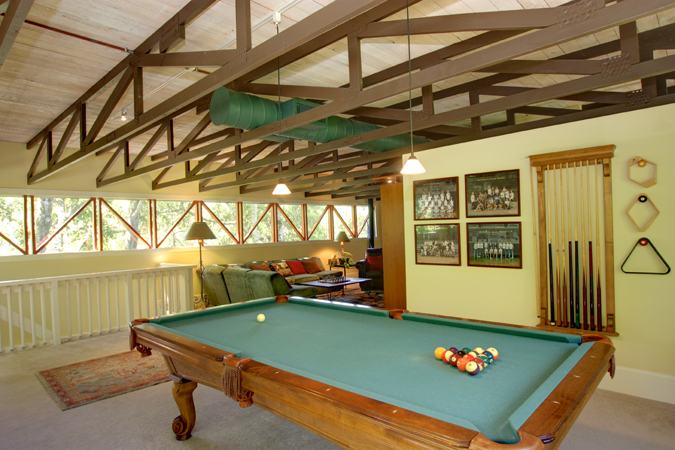 - There is a huge family/recreation/media/pool room upstairs with a free standing wood burning fireplace.