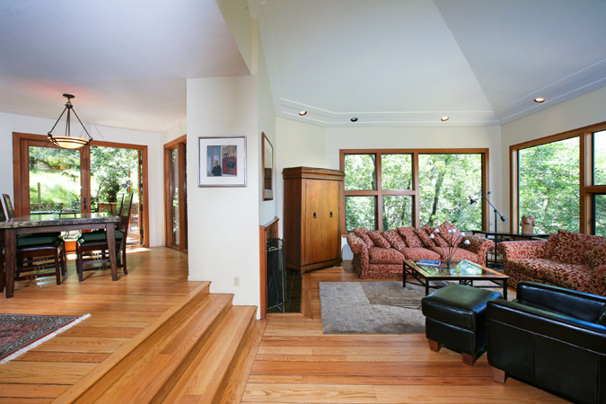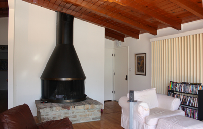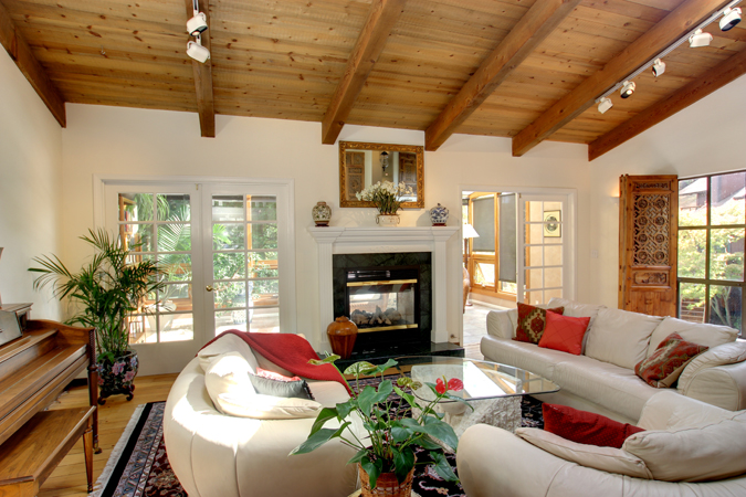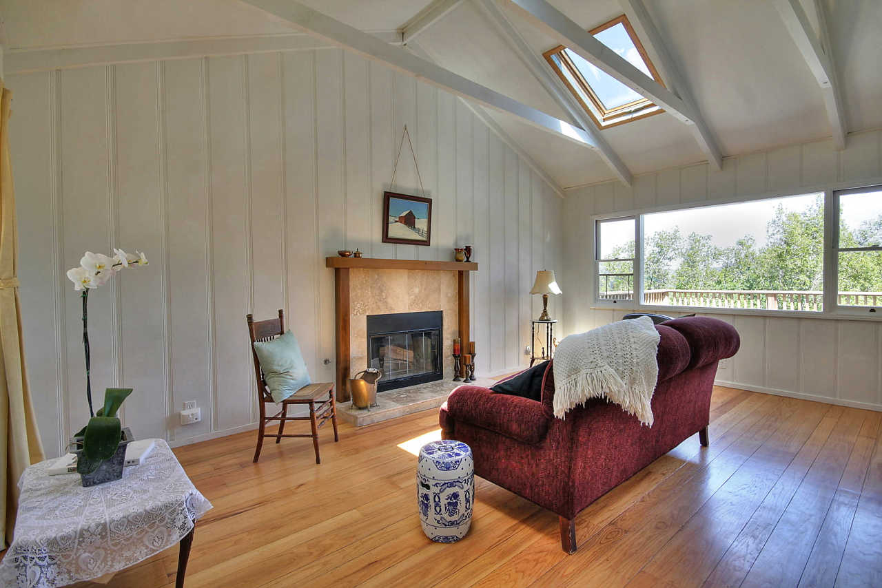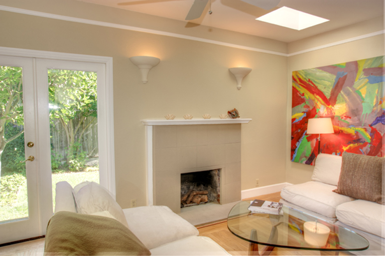 - Living room with stone fireplace raised ceiling, skylight, ceiling fan, hardwood floors and doors to garden giving great indoor/outdoor flow