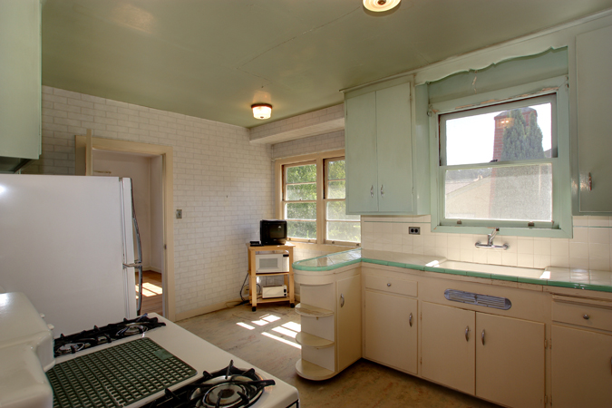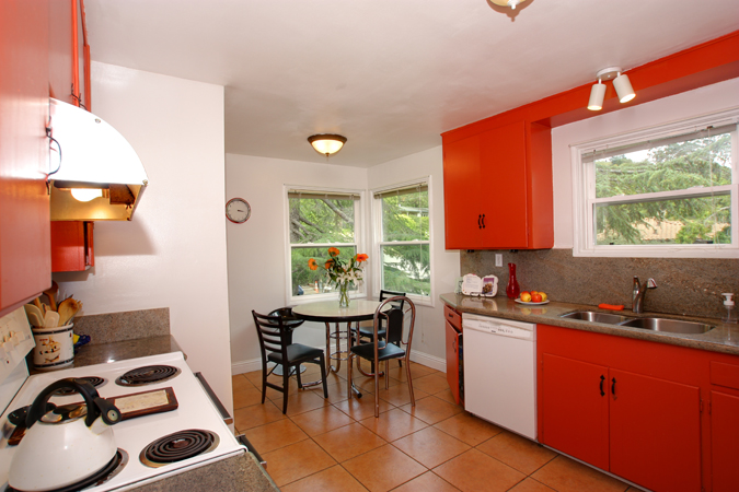 - Kitchen with gas range and breakfast nook, with adjacent utility/laundry room