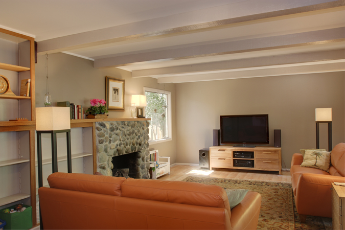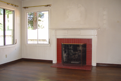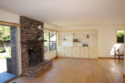 - Living Room with built in book cases, hard wood floors and wood-burning fireplace