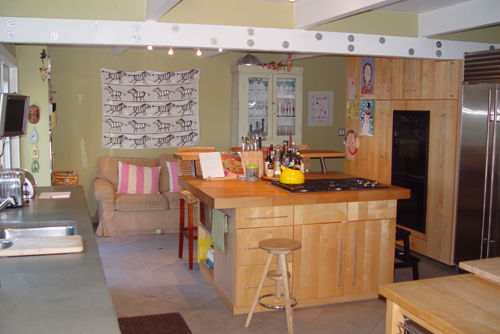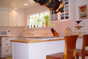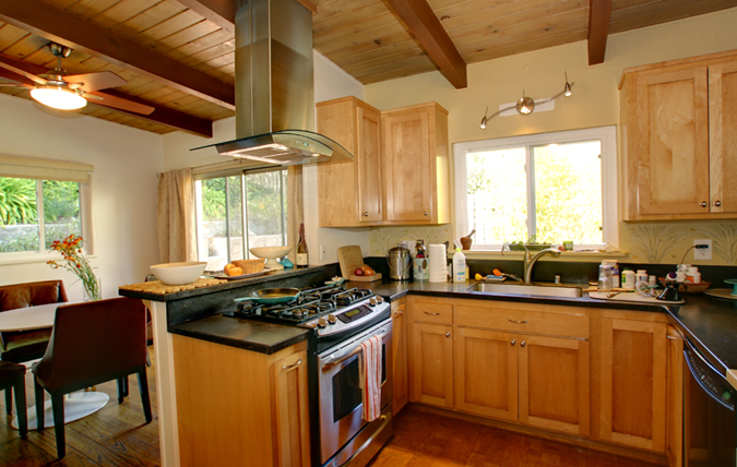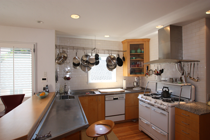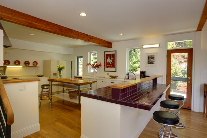 Gourmet Kitchen with butcher block surfaces and original wood paneled ceiling