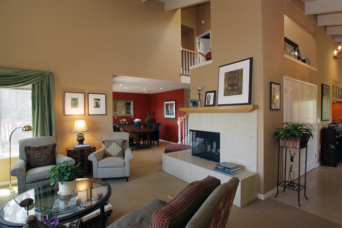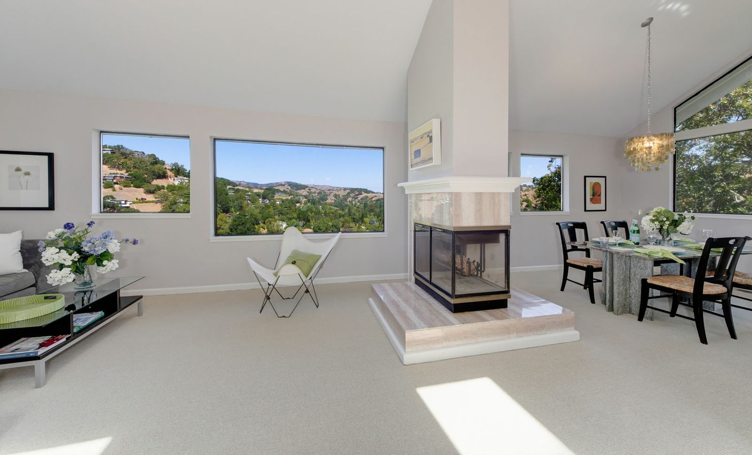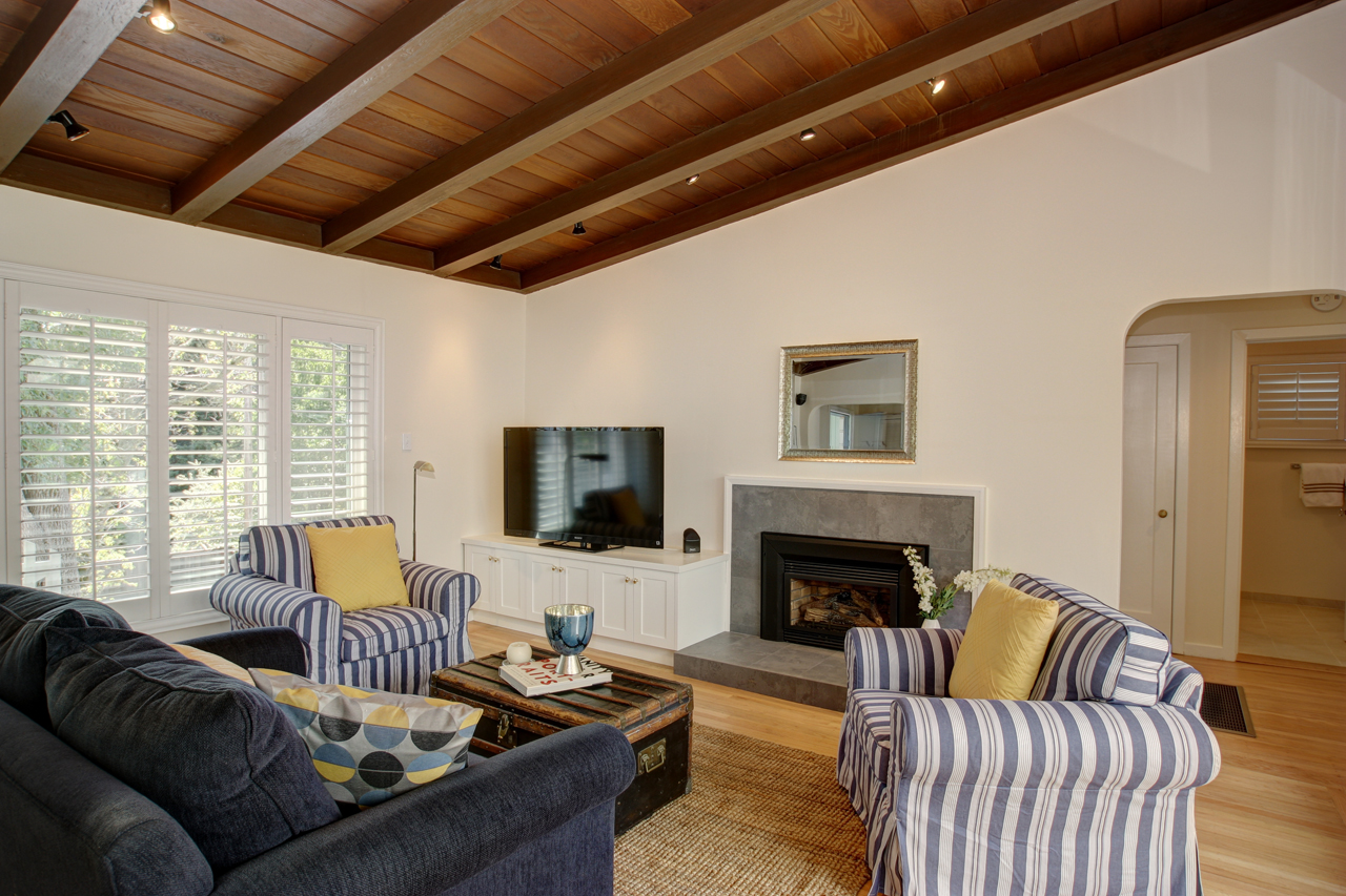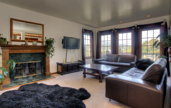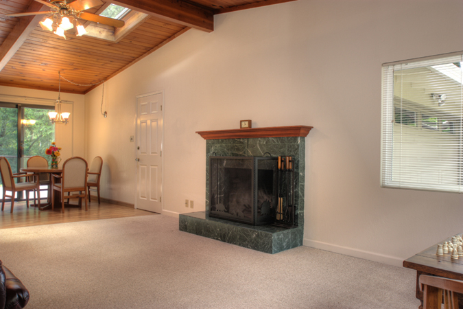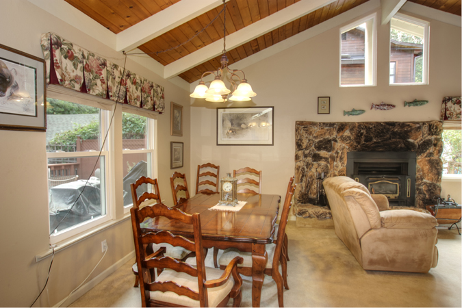 - Spacious living room and dining area with gas fireplace, large picture windows and sliding doors to covered rear deck