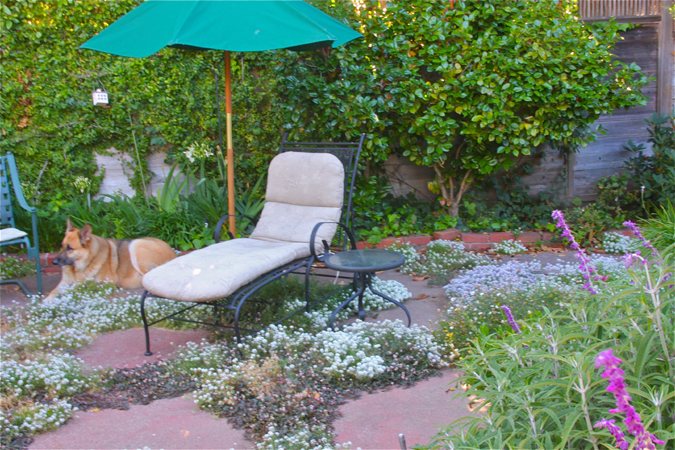 - Sunny level yard with roses and flowing shrubs