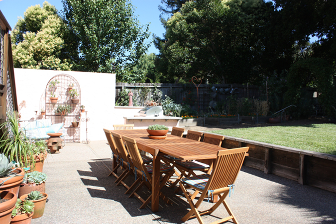- Large sunny and private rear backyard with flagstone and concrete patios, level lawn, raised planting beds. Plenty of room for children's play and gardening!