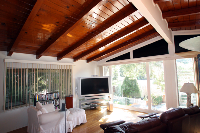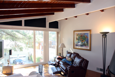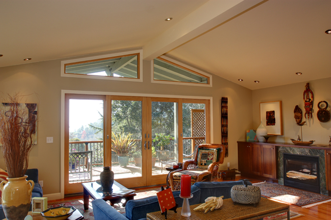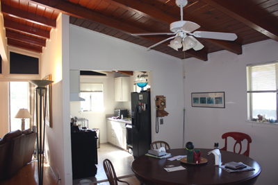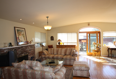- Family Room with cathedral ceilings, clerestory windows, ceiling fan, Mexican tile floor and French doors leading to the backyard