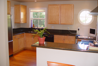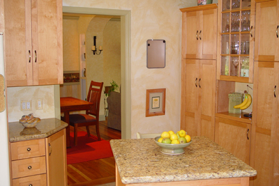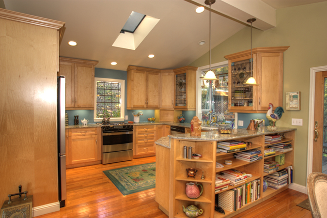 - Lovely remodeled kitchen with beautful birch cabinets, greenhouse window behind double sink, granite counters, and built in appliances