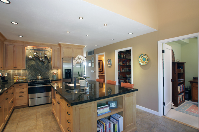 - Large remodeled kitchen with slate backsplash, stainless steel appliances, granite counters and island, big walk-in pantry and eat-in casual dining/breakfast area