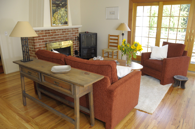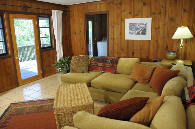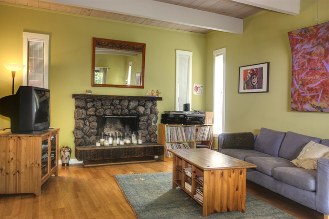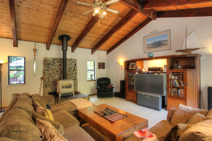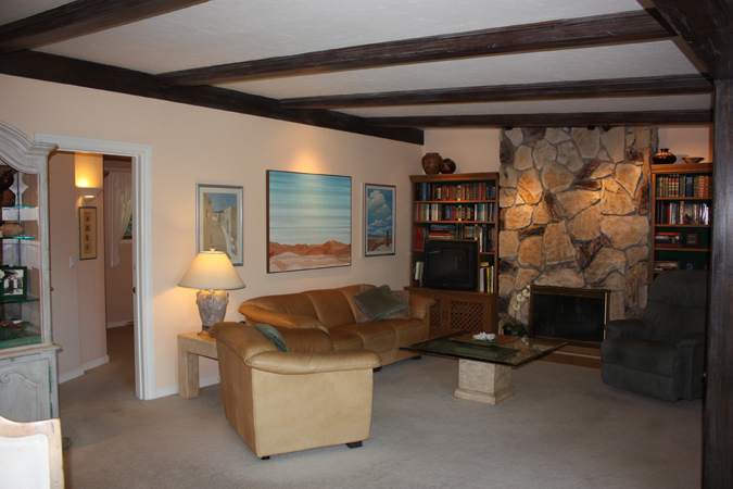 - Living room with river rock fireplace