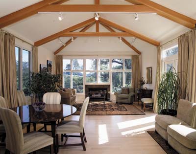 - Living room with open beam cathedral ceiling and limestone fireplace