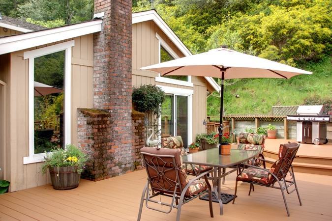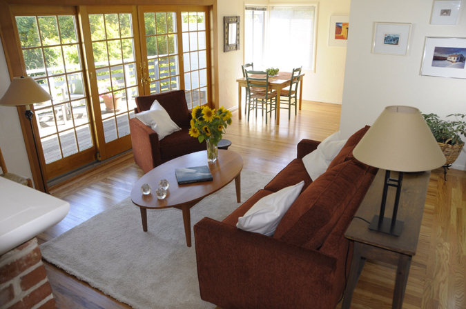 Sliding glass doors provide access from sunroom, living room and bedrooms to deck, patio and yard