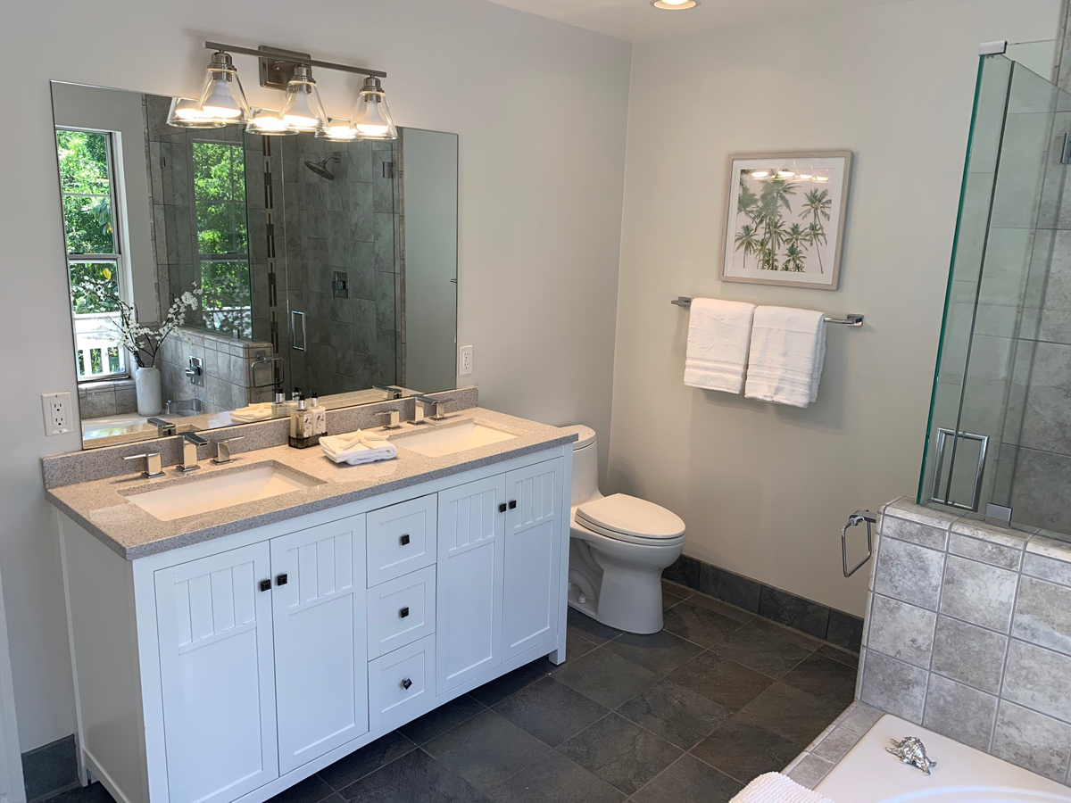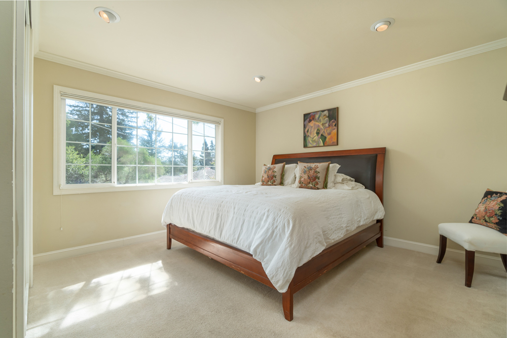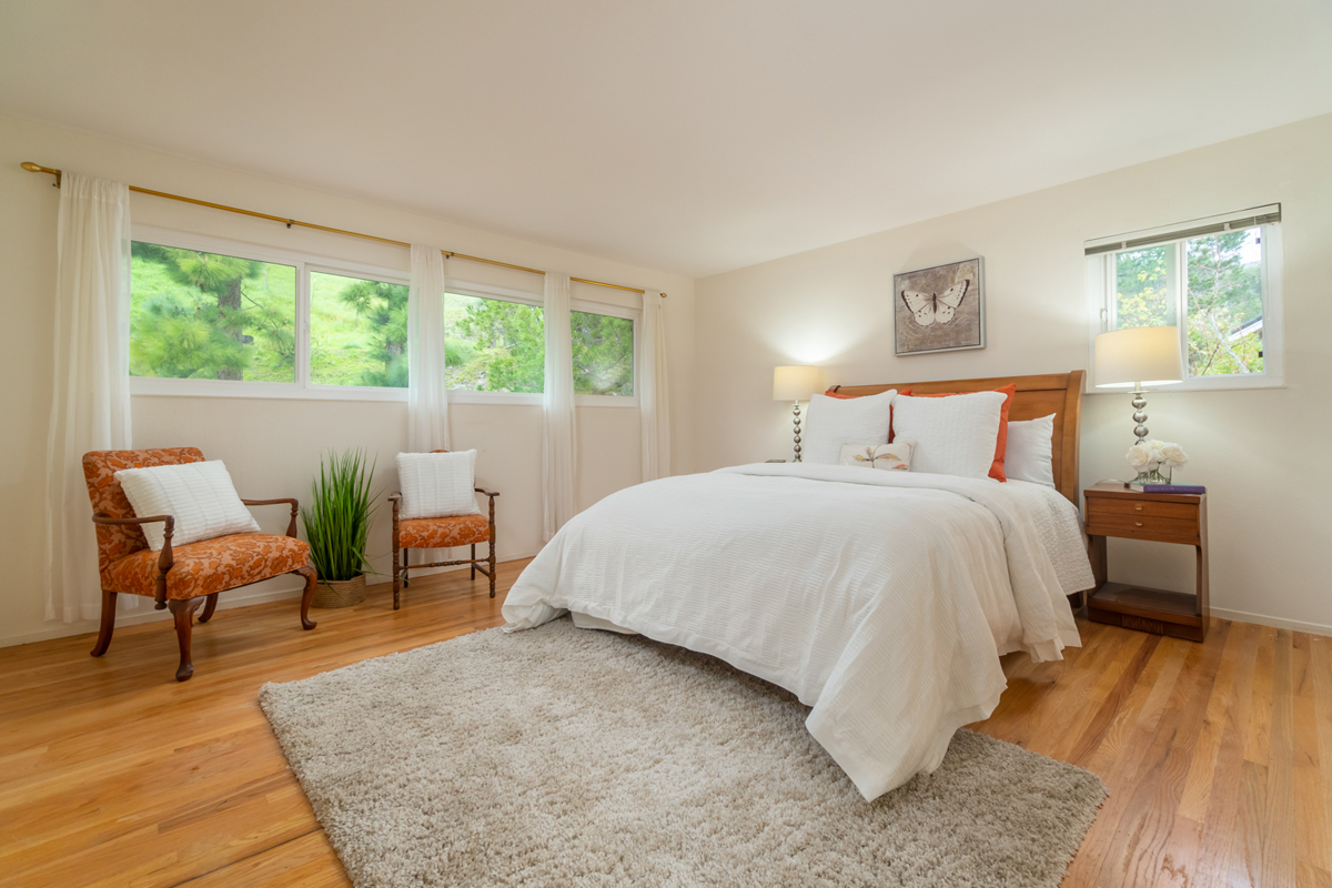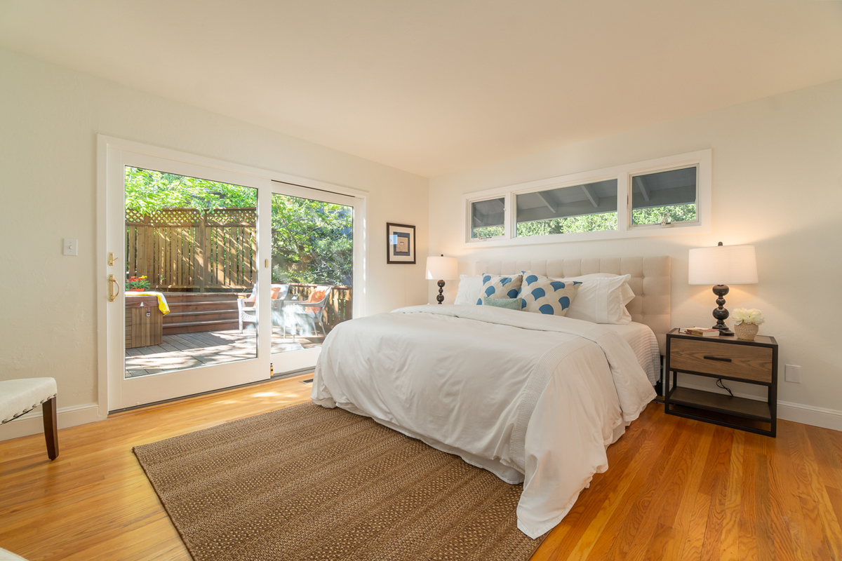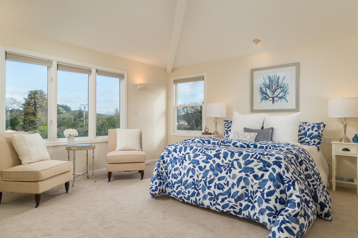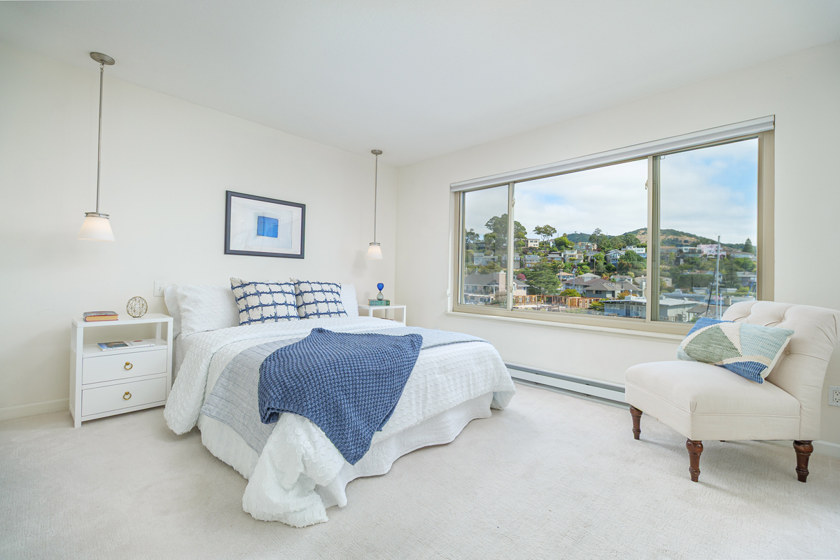 There is a deck off the living room with fabulous views and you can see Mt. Tam, the Richmond/San Rafael Bridge, the Marin islands, marshlands and Bay. The two large bedrooms are downstairs and both the primary and guest have en suite large bathrooms with a shared deck.