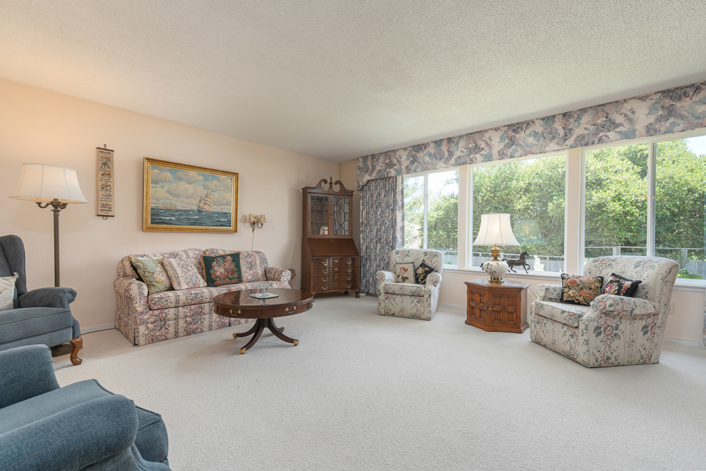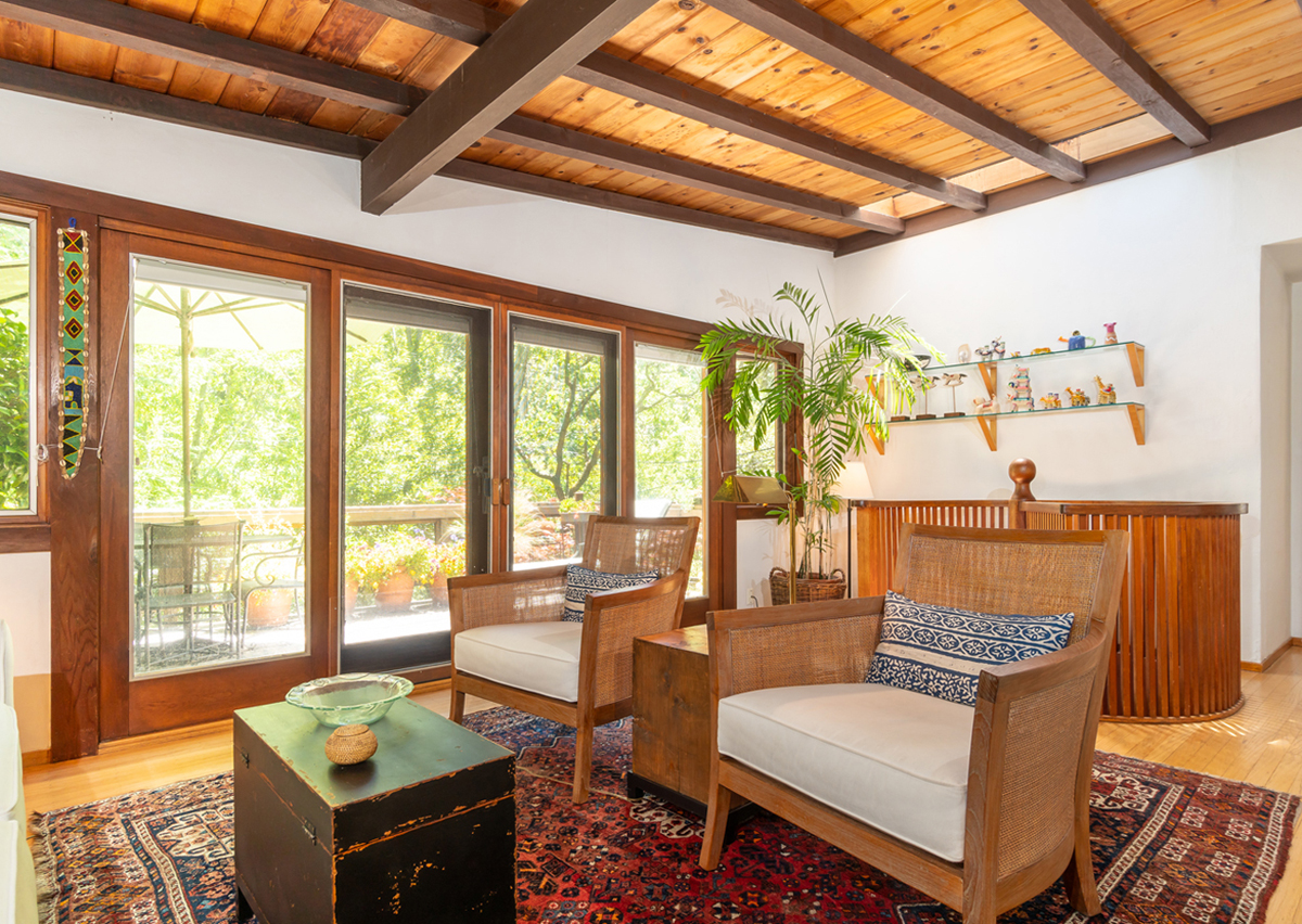 A bright formal living room with etrrace greets the visitor with warmth a meticulous details.