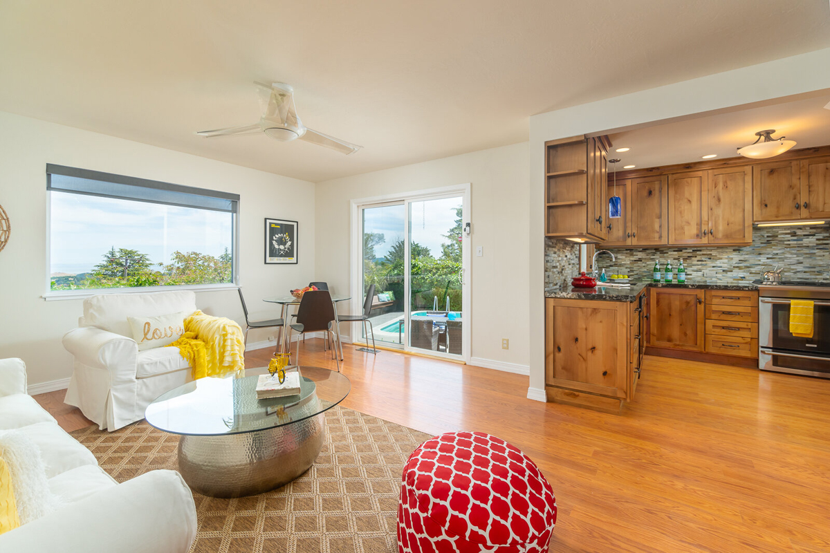 It is updated with a spacious living room that extends out to a private sun-drenched deck overlooking the boats, kayaks and paddleboards, not to mention the wonderful bird life on the water together with the occasional sea lions and otters.