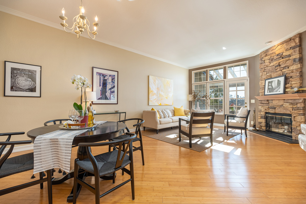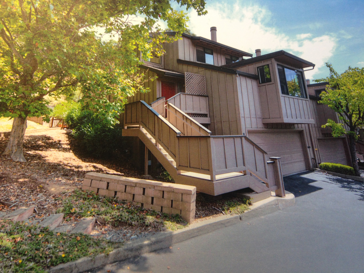 SOLD FOR $385,000 this lovely 2 bed 1.5 bath townhome has fabulous views and is situated in a convenient Southern Novato location. The home features a spacious living room with vaulted ceiling, slate fireplace, a casual dining area and high windows to let in all the light. The kitchen also has a slate floor, gas stove, built in microwave and pantry. The 2 bedrooms are a good size, one has a walk in closet large enough to be a separate office. There is a powder room on the main floor and large bathroom downstairs with two separate sinks and vanities. Both the living room and rear bedroom have attached view decks to take in the view of the bay and surrounding hills. There is a one car attached garage with storage cupboards and a parking deck.