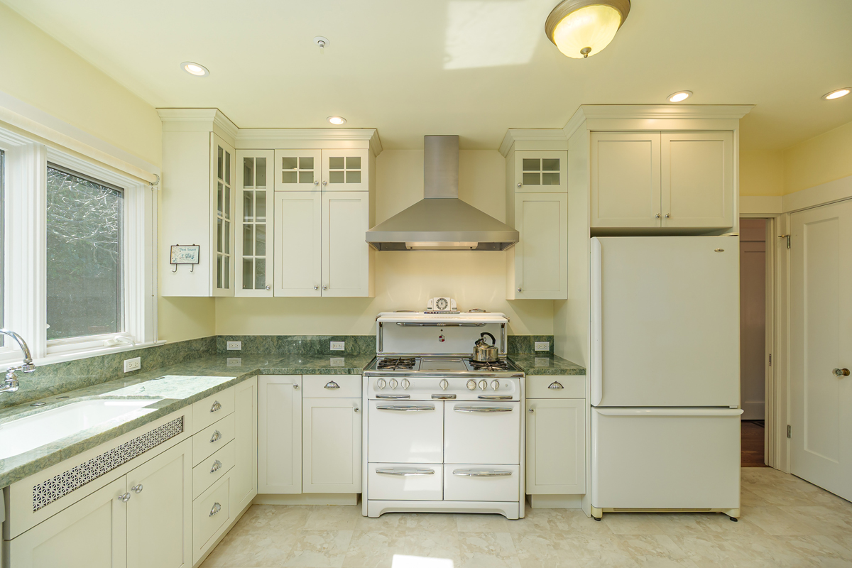 The kitchen has classic details. a gas oven and range and an adjoining dining area overlooking the rear garden