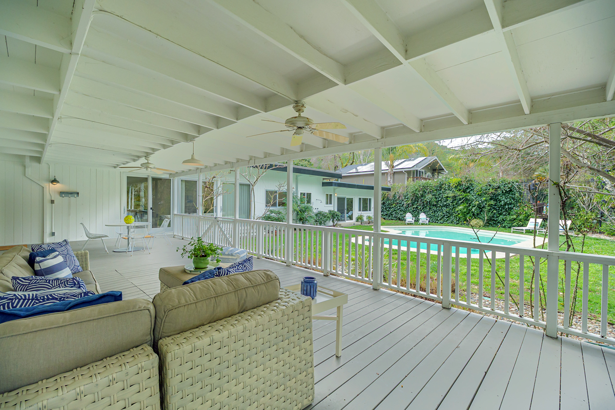 Enclosed back porch (sun room) looks out on to a beautiful sunny backyard with decks and patio, three palm trees, lawn, fruit trees, Japanese maples, roses, etc..